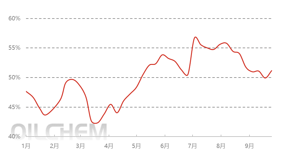 整个9月份,国内煤焦油深加工企业开工率位于50.79%,较8月减少3.22个百分点,较去年同期减少8.53个百分点。根据往年情况来看,9-10月份多为深加工企业秋季检修期,场内整体开工情况变动较大。另外10月份仍有部分装置例行检修,不过前期停工企业也在交替复工,因此整体开工或存提升预期。
